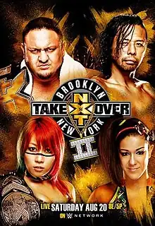 TakeOver was a series of professional wrestling shows that began in May 2014, as WWE's then-developmental league NXT held their second WWE Network-exclusive event, billed as TakeOver.[2] In subsequent months, the "TakeOver" moniker became the brand used by WWE for all of their NXT live specials. In 2015, NXT held an event titled NXT TakeOver: Brooklyn, which took place at the Barclays Center in Brooklyn, New York and was a support show for that year's SummerSlam pay-per-view. Announced on September 28, 2015, a second Brooklyn event, titled Brooklyn II, was scheduled to be held on August 20, 2016, at the same venue and also as a support show for that year's SummerSlam. Brooklyn II was the 11th NXT TakeOver event and in turn established TakeOver: Brooklyn as an annual subseries of TakeOvers that were held at the Barclays Center as support shows for WWE's annual SummerSlam.[3][4] Tickets went on sale on June 11 through Ticketmaster.[5]