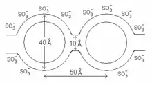 The first model for Nafion, called the cluster-channel or cluster-network model, consisted of an equal distribution of sulfonate ion clusters (also described as 'inverted micelles'[4]) with a 40 Å (4 nm) diameter held within a continuous fluorocarbon lattice. Narrow channels about 10 Å (1 nm) in diameter interconnect the clusters, which explains the transport properties.[3][4][12]