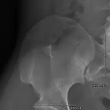 AP radiograph of the right iliac crest showing a bony exostosis or posterior iliac horn, which is pathognomonic of NPS