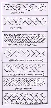 Most nakshi kanthas have some kind of border. Either a sari border is stitched on or a border pattern is embroidered around the kantha. The common border found in kanthas are as follows:[22]