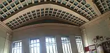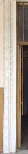 The repetition of plasters between rectangular windows make pattern on the facade. The entrance is defined by high platform and two Ionic columns. Inside, there are two Doric columns are following the two Ionic columns. Timber is used on the handrail. There are floral motives on the balustrades. The building has numerous marble ornamentations and a coffer ceiling. It has 2 terraces facing the garden.