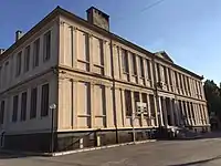 The building has Neo-Greek and Neo-Classic style. It has E-shaped plan. There is one main block and three perpendicular blocks. It has pitch roof and triangular pediments are emphasized on the facade.
