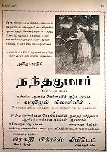 Nandakumar is a 1938 Indian Tamil-language film directed by Keshav Rao Dhaibar. Produced by A. V. Meiyappan, the mythological film stars T. P. Rajalakshmi, C. V. V. Panthulu, and T. S. Rajalakshmi. T. R. Mahalingam and T. R. Ramachandran made their cinematic debuts through the film.[2]