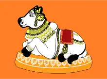 The application of the name Nandi to the bull (Sanskrit: Vṛṣabha) is a development of recent syncretism of different regional beliefs within Shaivism.[3] The name Nandi was widely used instead for an anthropomorphic door-keeper of Kailash, rather than his mount in the oldest Shaivite texts in Sanskrit, Tamil, and other Indian languages. Siddhanta texts distinguish between Nandi and Vṛṣabha.[4]