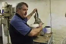 A jigger-and-jolley machine demonstrated by the curator of the Nantgarw pottery museum