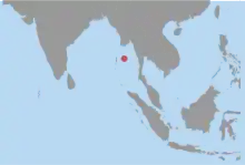 The entire population (estimate of about 200 birds in 1905[16] and 1984) is restricted to the single island of Narcondam in the Andaman Island chain. The island is clothed in forests and rises to a height of about 2300 feet above sea level. It is largely devoid of human presence.[17] The island is often hit by cyclonic storms in the Bay of Bengal. In 2000, an estimate of 434 birds was made for the population, with a density of 54[18] to 72 birds per square kilometre on the island, which has an area of about 6.8 square kilometres.[8] A nest site density of 2.8 pairs per square kilometer has been estimated.[19]