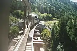 BC has had a long history with narrow-gauge railways starting with the horse-drawn and gravity-assisted Seton Lake tramway in 1858, and then to the 3 ft (914 mm) gauge coal mine railways at Nanaimo. Coal was moved to the pier at Departure Bay. Other railways sprang up including the Kaslo and Slocan Railway, the Columbia and Western Railway near Trail, and the Leonora and Mt. Sicker Railway on Vancouver Island. Narrow-gauge lines were used extensively in mining and logging. However, by 1910 narrow-gauge logging lines were phased out as it was found that they were unsafe for the large BC timber. Other small industrial lines used narrow gauge for a few years—the Kitsault Mine, and the Western Peat operation in Burns Bog. Narrow gauge worked in the Kootenays too at the coke ovens at Fernie and logging sites of Cranbrook. The White Pass and Yukon Route in the far north west corner of the province, connects Alaska, BC and the Yukon. It is still in operation and seasonally steam hauled. See List of historic BC Narrow Gauge railways.
