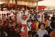 Music, often accompanied by a hsaing waing ("orchestra"), adds much to the mood of the nat pwè, and many are entranced. People come from far to take part in the festivities in various shrines called nat kun or nat naan, get drunk on palm wine and dance wildly in fits of ecstasy to the wild beat of the Hsaing waing music, possessed by the nats.[4]
