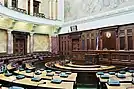The building's interior was designed by architect Nikolai Krasnov in academic traditional style. Covering about 13,400 m2 (144,000 sq ft), it has four storeys: a basement, ground floor, first floor, and attic, with mezzanines below the basement, between the basement and the ground floor and between the ground and first floors. The building has 100 offices, large and small halls, and four committee rooms. The 165-square-metre (1,780 sq ft) library, on the first floor, contains over 60,000 books.[3] The building is decorated with 23 frescoes and a number of paintings, sculptures, and other fine artwork.[1]