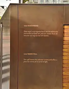 Further monuments and a museum commemorating the Holocaust are the nearby Auschwitz Monument by Jan Wolkers in the Wertheim Park to the east of the Holocaust Names Memorial, and the upcoming National Holocaust Museum at Plantage Middenlaan 27, Amsterdam, opening in September 2023.[5] At the former Westerbork transit camp (Dutch: Kamp Westerbork) in Hooghalen, Drenthe, there is the 102.000 Stones Monument (Dutch: De 102.000 stenen), with a stone without a name for each victim.[6] On the internet a searchable database of all Dutch Jewish victims is available as Joods Monument (Jewish Monument).[7]