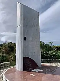 Tarakohe 40°49′16″S 172°54′09″E / 40.8212°S 172.9026°E | The Abel Tasman Monument is a memorial to the first recorded contact between Europeans—led by the Dutch explorer Abel Tasman—and Māori in New Zealand's Golden Bay on 18 and 19 December 1642. It was unveiled on the tercentenary of the encounter by the prime minister, several government ministers, and a Dutch delegation. The monument was designed by the architect Ernst Plischke as an abstracted sail, and consists of a large concrete monolith painted white. Located on a bluff at Tarakohe just east of Pōhara, the land for the monument was gifted by the Golden Bay Cement Company. The dignitaries opened the Abel Tasman National Park the following day and the area holding the monument is part of the national park. As was typical for the 1940s, the original inscription focused on the European experience only and overlooked the Māori perspective, demonstrating Western-centric systemic bias. |