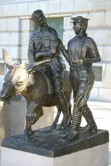 A bronze sculpture by Paul Walshe of Richard Alexander Henderson as The Man with the Donkey stands outside the National War Memorial. It is based on the photograph of Henderson taken at Gallipoli by James Gardiner Jackson on 12 May 1915, and is a "tribute to all medical personnel, stretcher bearers and ambulance drivers who served alongside New Zealand troops in wartime". Commissioned by the Royal New Zealand Returned and Services' Association with sponsorship from Oceanic Life,[44] it was unveiled by Henderson's son Ross on 20 April 1990.[5] An inscription reads: