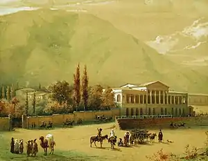 As for the palace, the contribution of Simonson is confirmed in scientific journals and researches. They note that the architect has significantly expanded the old residence of the Viceroy, moved its side wings forward, while the main facade was changed slightly. On the main floor, the central reception hall was altered and enlarged. In the North, he arranged a large foyer, including the festive staircase, a large dining room with a portico and a salon. While in the South, a working office of the Viceroy was located along with a reception and a living room, as well as an exhibition hall, with a terrace and a wide, open staircase to the garden. A bedroom and a boudoir of the Viceroy were overlooking the garden from the middle part of the building. He also added some supporting and entertainment rooms.[6] The facade, typical to classicism, was treated by the Renaissance motifs, the walls were processed with stonework technique and beautified with Musharabi panels. The large dining room was designed in the Persian style, its walls encrusted and curved with ornamental mirrors. According to Simonson's ordinance, the ceiling was adorned with the stalactite niche just like in the working office, windows were filled with the colorful glass, the gilded chandeliers were hung in the hall, the living room, reception, foyer and the lobby were "decorated" with the black and colorful marble chimneys. The more festive look was given to the South facade, directed to the garden. Therefore, the 19th century Tbilisi acquired a public building distinctive with its high artistic value, given even more distinctive expression by the unique garden.[7]