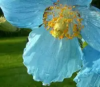 The national flower of Bhutan is the Himalayan blue poppy (Meconopsis gakyidiana). In Bhutan, it grows to a height of 1 meter on the rocky mountain terrain, above the tree line at altitudes of 3500m to 4500m. Bhutanese tradition links this flower with the yeti of lore. The flower was discovered in 1933 by British botanist George Sherriff in remote part of Sakteng in eastern Bhutan.[15]