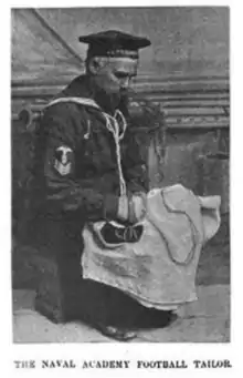 The Naval Academy's football program is one of the nation's oldest, with its history dating back to 1879.[4] There were two separate efforts to establish a Naval Academy football team in 1879. The first was guided by first-classman J.H. Robinson, who developed it as a training regiment to help keep the school's baseball team in shape. The team played the sport under rules that made it much closer to soccer, where the players were permitted only to kick the ball in order to advance it.[5] The second effort, headed by first-classman William John Maxwell was more successful in its efforts. Maxwell met with two of his friends, Tunstall Smith and Henry Woods, who played for the Baltimore Athletic Club and officially challenged their team to a game with the Naval Academy.[6] A team was formed from academy first-classmen, which Maxwell led as a manager, trainer, and captain. The team would wake up and practice before reveille and following drill and meals. The squad received encouragement from some of the faculty, who allowed them to eat a late dinner and skip final drill for additional practicing. This was against the direct orders of the school superintendent, who had banned football and similar activities.[6][7]