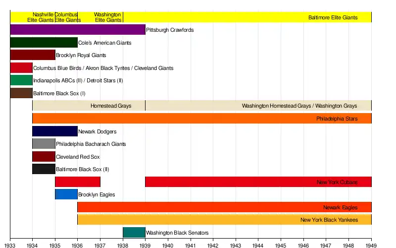 - Nashville Elite Giants (1933–1934) / Columbus Elite Giants (1935) / Washington Elite Giants (1936–1937) / Baltimore Elite Giants (1938–1948)