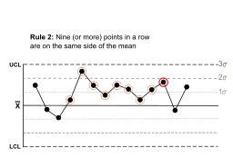 Rule 2 | Nine (or more) points in a row are on the same side of the mean. | ![]() | Some prolonged bias exists. |