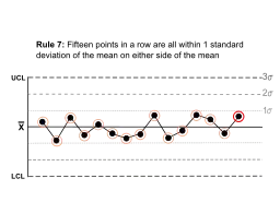Rule 7 | Fifteen points in a row are all within 1 standard deviation of the mean on either side of the mean. | ![]() | With 1 standard deviation, greater variation would be expected. |