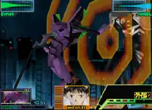 The player controls one of these pilots through a series of levels, each being based on a specific episode of the anime.[5][3] The pilots faces can be seen during battle and change their facial expression in reaction to events just like in the original anime.[6] The Evangelion must defeat an enemy Angel through melee and projectile attacks, while preventing the Angel from inflicting damage on the Evangelion.[5][7] The Evangelion begins with standard kicking and punching attacks; later levels allow it to use weapons such as machine guns and knives.[5][3] Inputting specific button commands enacts a short cutscene showing the Angel being heavily damaged in battle.[8] One mission in the game plays similarly like Bust a Groove.[9]