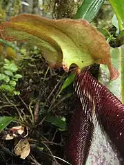 Rosette and lower pitchers are typically ovate in the basal quarter to half of the pitcher cup, becoming cylindrical and sometimes slightly infundibular above. A conspicuous hip often delimits these two parts of the trap. Terrestrial pitchers may be quite large, reaching 30 cm in height by 6 cm in width. A pair of fringed wings (≤6 mm wide) runs down the ventral surface of the trap, bearing filaments up to 12 mm long. The peristome is cylindrical at the front and becomes flattened and broader towards the sides and rear, measuring up to 3 cm in width. It bears ribs up to 2 mm high and spaced up to 2.5 mm apart. These ribs terminate in teeth (≤8 mm long) on the inner margin of the peristome, the largest being located towards the top. There is often a gap of several millimetres separating the two lobes of the peristome directly below the lid. The pitcher lid or operculum is ovate to orbicular and typically has a cordate base as well as a frilled margin. It measures up to 6 cm in length by 4.5 cm in width. A triangular or hook-shaped basal crest (≤1 cm long) is commonly present on the lower surface of the lid. An unbranched spur measuring up to 10 mm in length is inserted near the base of the lid. Lower pitchers typically have a very dark pigmentation, being purplish-black throughout. However, the indumentum covering the traps can give them an orange or brownish sheen. The peristome is generally purple, black, or dark brown, but may have lighter coloured teeth ranging from green, through yellow, to white. The inner surface of the pitcher may be light yellow, white, or light purple, and often bears purple speckles. The pitcher lid is often yellow or green on the underside and dark purple on its upper surface. Occasionally, the pitcher may be yellowish-green throughout with a black peristome.[4]