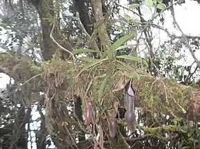Right: Nepenthes izumiae growing as an epiphyte on a moss-covered branch in upper montane forest