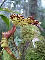 Rosette and lower pitchers are ovoid in the lower part, becoming cylindrical above. They are large, growing to 33.5 cm high by 6.8 cm wide. A pair of fringed wings (≤0.5 cm wide) runs down the ventral surface of the pitcher cup. Fringe elements are up to 1.9 cm long. The pitcher mouth is ovate and elongated into a short neck at the rear. The greatly expanded peristome may be up to 5.8 cm wide at the sides. Its inner margin is lined with distinct teeth, with those of the neck reaching 0.4 cm in length. The pitcher lid or operculum is ovate and has an unusual undulate margin. It measures up to 8.5 cm in length by 7.2 cm in width and has a cordate base. Four to five pairs of veins are visible on the upper surface of the lid. The lid bears two prominent appendages on its lower surface. The first is a hooked basal crest up to 0.7 cm long. The second is a triangular, dichotomous appendage present near the apex. This unique feature measures up to 1.4 cm in length and bears large nectar glands (0.5 to 1 mm in diameter). Smaller glands (0.1 to 0.5 mm in diameter) are concentrated along the midrib. An unbranched spur (≤2.8 cm long) is inserted near the base of the lid.[2]