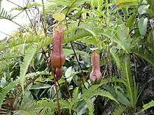 Upper pitchers are typically somewhat infundibular in the lowermost part, becoming narrowly ovoid in the lower third, and finally cylindrical and slightly narrower above. They may be quite large, reaching 25 cm in height by 5 cm in width.[5] The waxy zone of the inner surface is well developed.[8] A pair of remnant ribs is present in place of the ventral wings.[5] The inner portion of the peristome accounts for around 40% of its total cross-sectional surface length.[8] Other parts of aerial pitchers are similar to their lower counterparts.[5]