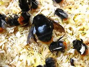 Bombus rupestris, a cuckoo bumblebee, killed by members of the Bombus lapidarius nest it was trying to usurp (image includes red-tailed Bombus lapidarius workers who died defending their nest)