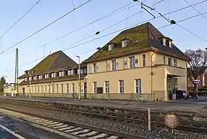 Neu-Edingen/Mannheim-Friedrichsfeld station (formerly Mannheim-Friedrichsfeld) is a separation station in the Mannheim district of Friedrichsfeld on the border with the municipality of Edingen-Neckarhausen in the German state of Baden-Württemberg. All rail tracks are in Mannheim, only the station building is located on the territory of the Edingen-Neckarhausen hamlet of Neu-Enghien. It is classified by Deutsche Bahn as a category 4 station.[2] It has been served by the Rhine-Neckar S-Bahn since December 2018.