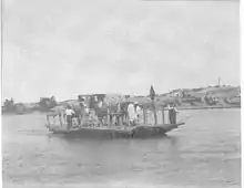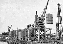 The construction of the bridge was interrupted by three floods that destroyed tracks and makeshift bridges and interrupted traffic.[12] On July 12, 1900, a telegraph message from Paso de los Indios warned the construction site of an upcoming major flood of the river. The initial report indicated that the waters raised 1.7 metres (5.6 ft), while an update the next morning showed 6 metres (20 ft) and raising. The staff was then ordered to move everything from the construction site to safety at Limay Station only leaving behind provisory bridges and tracks. Two boats and a speedboat, all steam powered, were ordered to remain on the southern bank and to maintain constant pressure day and night. By 8 PM, the station at Paso de los Indios registered a height of 8 metres (26 ft) to 9 metres (30 ft). After the waters raised to 3.5 metres (11 ft) by 10 PM at the construction site, all work was interrupted.[13] The highest part of the construction, two cylinders that held the airlock were visible due to a wave that rose above them.[12] Five men on a shack who refused to move to higher ground needed to be rescued, as well as some of the workers of the general store. Two rescue trips by one of the small boats were successful, while during the third trip it capsized throwing all three of the rescued men to the waters. The workers reached the roof of the shack where they were previously trapped, and they were later rescued by the powerboat.[14]