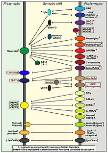 8. 1 2 3 4 Dean C, Dresbach T (January 2006). "Neuroligins and neurexins: linking cell adhesion, synapse formation and cognitive function". Trends in Neurosciences. 29 (1): 21–29. doi:10.1016/j.tins.2005.11.003. PMID 16337696. S2CID 11664697.