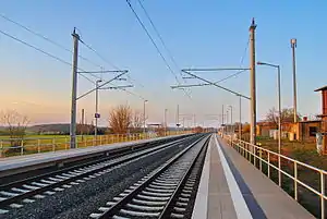 In June 2007, the first upgraded section between Rostock and Lalendorf Ost was reopened after a year of complete renovation. From June 2010 to April 2012, the Neustrelitz–Kratzeburg section was upgraded with train operations running on a single track.[10] The section between Kratzeburg and Waren will follow. Upgrading on the line between Waren and Lalendorf has been underway since September 2012[7] and the train service on this section was closed from 10 September 2012 to 26 April 2013 for this work.[6]