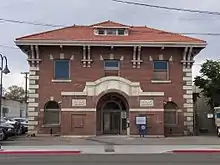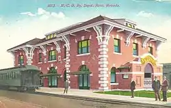 The Nevada–California–Oregon Railroad built classic brick depots in Reno and Lakeview. A smaller stone masonry station was constructed in Alturas.[2] All three passenger depots still exist, and are listed on the United States National Register of Historic Places along with the locomotive house and machine shop in Reno.[7] The N-C-O railway office in Alturas and the depot at Lakeview are examples of the 1880s style of architecture known as Mission Revival. The features include solid massive walls with buttressing, broad unadorned wall surfaces, wide projecting eaves, low-pitched tile roofs, corridors with Roman aqueduct-like arches, terraced bell towers and mission belfry facades. (See The Journal of the Modoc County Historical Society, No. 11, 1989.) The style showed up at Stanford University, the Southern Pacific depot in Santa Barbara and the Mission Inn in Riverside. The architect for many N-C-O buildings was Carl Werner of San Francisco. However, he did not design the railroad's three main depots.
