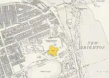 In 1830, James Atherton purchased much of the land at Rock Point,[1] in the north-east corner of Wallasey opposite the city and docks of Liverpool.[2] He renamed it New Brighton and organised its development as a tourist destination.[3] In July 1896 a new group, the New Brighton Tower and Recreation Company, with a share capital of £300,000, purchased the estate of the demolished Rock Point House.[4] Their ambition was to create an observation tower in the grounds, designed to rival the Blackpool Tower,[5] while using the remaining grounds to create a more "elegant" atmosphere.[2] The New Brighton Tower and Recreation Company had more than 20 acres (8 ha) of land available to construct the tower, which enabled them to include more attractions than at Blackpool Tower.[2]