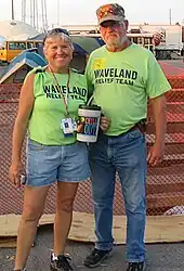 A unique bond between two very disparate groups was formed as a result of the hurricane. Two groups, the Bastrop Christian Outreach Center (BCOC) and attendees of the counter-culture Rainbow Gathering, arrived around the same time in Waveland.[11] The BCOC efforts were led by Reverend Colonel Pete and Fay Jones who were among some of the first responders.[17] Each group represented very different philosophies and had little common faith, each was able to put aside their differences and focus entirely on their humanitarian efforts.[11] The cooperation between the two groups was described as "unlikely",[7] a "bunch of hippies and evangelical Christians"[18] and the "unlikeliest of bedfellows".[7]