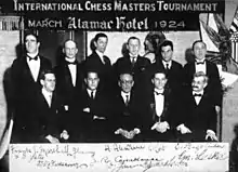 New York 1924 was an elite chess tournament held in the Alamac Hotel in New York City from March 16 to April 18, 1924. It was organized by the Manhattan Chess Club. The competitors included world champion José Raúl Capablanca and his predecessor Emanuel Lasker. Nine other top players from Europe and America were also invited. Emanuel Lasker met Alexander Alekhine, Efim Bogoljubow, Géza Maróczy, Richard Réti, Savielly Tartakower and Fred Yates in Hamburg. They steamed with the SS Cleveland on February 28, 1924, and joined Capablanca, Frank Marshall, Dawid Janowski and Edward Lasker in New York. The tournament was played as a double round robin, with each player meeting every other one twice. Emanuel Lasker won $1500 for first prize, plus generous payment for travel expenses. Capablanca won $1000, compensation for expenses, and an extra payment.[1]