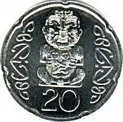 In 1990, the new $1 and $2 coins were released to replace the $1 and $2 notes. As the $1 depicted a kiwi also, the 20-cent's reverse had to be redesigned. The new reverse side featured the well-known Māori carving depicting Pukaki, a chief of the Ngāti Whakaue iwi (tribe) of Te Arawa.[1] In 1999, the portrait of the Queen was changed to a version by Ian Rank-Broadley which had been introduced to the coins of the pound sterling in the previous year.[2] No 20-cent coins were minted between 1991 and 2001.[3]