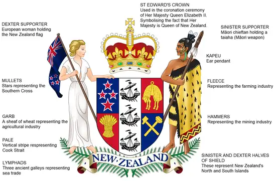 - 1 2 3 4 "Coat of Arms". www.mch.govt.nz. Ministry for Culture and Heritage. Retrieved 23 August 2017.
