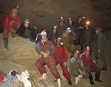 A New Zealand group of cavers posing for a group photo in a Waitomo-area cave.