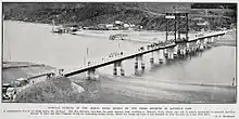 The 12 ft (3.7 m) wide, single-lane,[11] 11-span, 670 ft (200 m), steel, Mokau Bridge opened in October 1927 (official opening 17 December), replacing a punt.[15][16][17] The cost was £35,000 (2016 equivalent $3.3m).[18][6] It had a lifting span allowing passage of vessels up to 50 ft (15 m) wide and with a 60 ft (18 m) clearance at high tide.[16] In 2001 the 1927 bridge was replaced by the current 9-span, 230 m (250 yd), double lane, pre-stressed concrete bridge for $6.2m[19] (2016 equivalent $8.5m).[6] The new bridge doesn't allow for shipping, as the first ship to pass under the old lifting span was withdrawn three months after the bridge opened.[20]