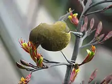 Bellbirds feed on nectar, fruit and insects. Insects are important for females and their chicks during the breeding season. As honeyeaters, with brush-tipped tongues that enable them to sip nectar and the honeydew found on the trunks of beech trees,[7] they play an important part in pollinating numerous native plants such as mistletoe, fuchsia, and kowhai.[8]