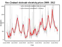 In 2009, the Commerce Commission released a report by Stanford economist Frank Wolak on the ability of the four largest electricity suppliers to exercise unilateral market power in the wholesale electricity market and the economic rents (any payment in excess of the cost of production) that may have resulted.[12][13] Using empirical industrial organization techniques, Wolak estimates these rents to be $4.3 billion over the 7 years he studied when compared with a perfectly competitive market. The methodology he used and the results are also described in a working paper.[14] His report was criticised for aspects of its methodology, with the Electricity Technical Advisory Group (ETAG), Ministry of Economic Development, claiming that there is no evidence of the sustained exercise of market power.[15] The Commerce Commission decided not to act. Rex Ahdar, University of Otago, later opined that competition law in New Zealand is inherently ill-suited to tackling a network industry such as electricity.[16]