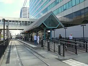 Newport station is a station of the Hudson–Bergen Light Rail in Jersey City, New Jersey. Located on Mall Drive East near the Newport Centre shopping mall, the station services trains operating between Hoboken Terminal and Tonnelle Avenue station in North Bergen to West Side Avenue in Jersey City and 8th Street station in Bayonne. The station is also a stop on the Bayonne Flyer, an express service on the light rail. Newport station also serves as a transfer to the PATH line between Newark Penn Station, Hoboken Terminal and the 33rd Street and World Trade Center stations in New York City at its Newport station. The station consists of a single island platform to service two tracks. As of 2014, it is the busiest station on the HBLR system (with an average of 6,122 passenger boardings daily).[3]