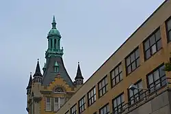 The most recent addition was completed in 1958 and designed by Maurice E. Salo and Associates. This wing took the place of the original school building by Boring and Tilton which had been deemed by the Board of Education to be deficient and not able to be improved by renovations. Instead of echoing the motifs of the previous additions, the four-story rectangular block addition was designed in the International Style. The steel-frame structure is clad with beige-colored bricks, limestone trim and aluminum panels.