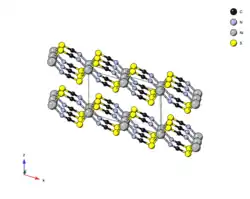 The structure of Ni(SCN)2 was determined via single-crystal X-ray diffraction and consists of two-dimensional sheets held together through Van der Waals forces. It belongs to mercury thiocyanate structure-type and can be considered a distorted form of the NiBr2 (CdI2) structure. Each nickel is octahedrally coordinated by four sulfurs and two nitrogens. The sulfur end of the SCN ligand is doubly bridging.[1]