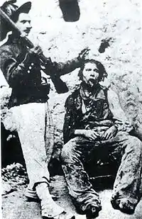 A bersagliere posing with the dead body of Napolitano after his execution by firing squad.