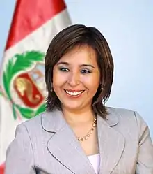 In June 2009, she was switched to the Minister of Women and Social Development upon the resignation of Carmen Vildoso. During her tenure, she took initiative in promoting public policies that improved equality of opportunities and family.[5] During her management, the “Gratitude” program was created, aimed at those over 75 years of age, and the free delivery of 5 million identity documents - DNI, to children under 14 years of age in agreement with the National Registry of Identification and Civil Status (RENIEC). She resigned in September 2010 in order to run for congressional reelection at the 2011 general election, although she was not reelected.[6]
