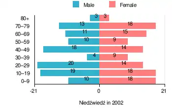 According to the 2002 Poland census, there were 226 people residing in Niedźwiedź village, of whom 47.8% were male and 52.2% were female. In the village, the population was spread out, with 25.7% under the age of 18, 29.6% from 18 to 44, 19% from 45 to 64, and 25.7% who were 65 years of age or older.[1]