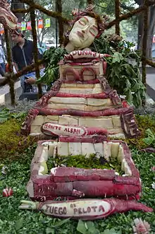 The formal Noche de Rábanos competition focuses on the carving of radishes, which can be embellished with other elements.[1] Most entries are scenes that use multiple radishes, with the most traditional being nativity scenes. However, over the 100+ years that the competition has been held, there has been significant diversification in the entries.[3] Common scenes are related to life in Oaxaca such as the Guelaguetza, posadas, calendas (a kind of traditional party), Day of the Dead, Danza de la Pluma, Pineapple Harvest Dance and the Chilena from the Costa Chica, Oaxacan history and folklore as well as the veneration of Our Lady of Guadalupe, Our Lady of Juquila and Our Lady of Solitude, the patron of the state.[3][4][5] However, they can also depict other themes such as non-Christmas Biblical stories and can even be in protest.[6] The most common elements are the people, animals, food and handcrafts of the state, but they can also include duendes, snowmen, monsters and more.[4][7]