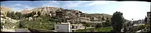 A panorama photograph of Niha, Zahle. The Lower Great Temple in the village is barely visible to the far left (1). The red roof of the church of the Prophet Elias is seen about a quarter of the photograph from the left (2). The old Roman quarries can be seen in the distance (3) on the way to the Hosn of Niha. Rayak and the Bekaa plain are to the far right (4). Some of the village's vineyards are also visible (5).